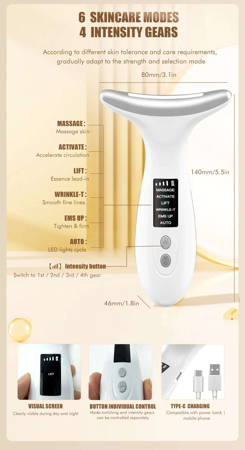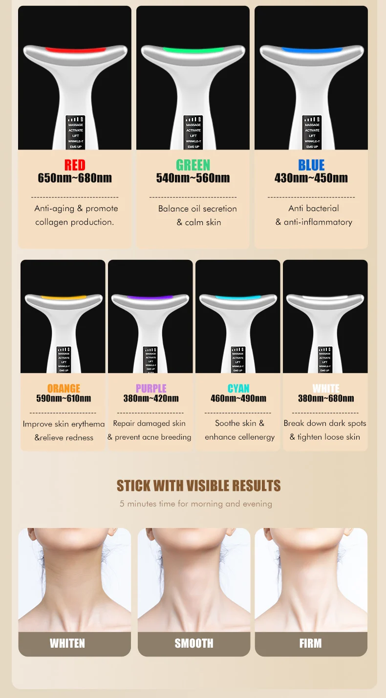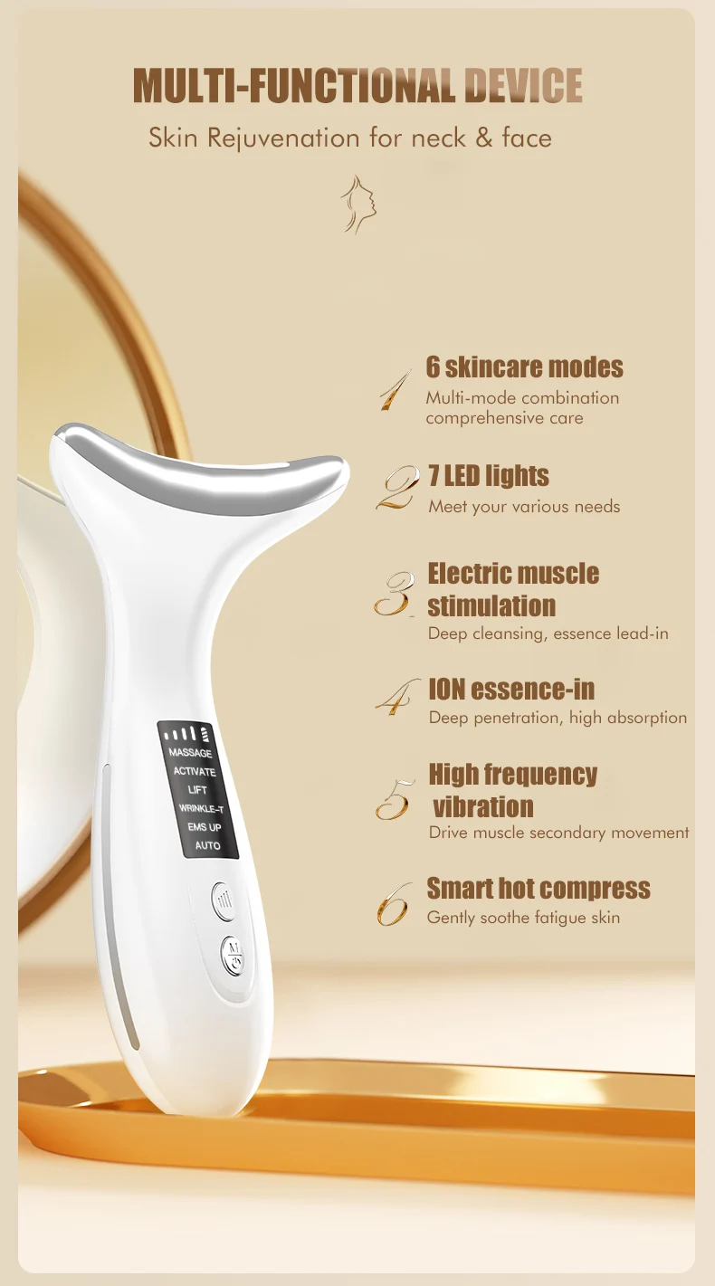 ✨ Transform Your Skincare Routine! 🌈 What it is - Experience the ultimate in beauty therapy with our 7-Color LED Facial Massager, designed for radiant skin and firming results! This innovative tool combines red light therapy with gentle massage for a rejuvenating experience at home, perfect for targeting fine lines, uneven skin tone, and improving overall appearance.💡 Why you need it - - Stimulates collagen production for youthful skin - Reduces wrinkles and fine lines - Evens out skin tone and texture - Easy and convenient for home use - Enhances absorption of skincare products ❤️ Why you’ll love it - - Multiple color settings allow customization for different skin concerns - Lightweight and portable, perfect for on-the-go beauty - Soothing massage promotes relaxation and stress relief - User-friendly design ensures effortless use📅 How to use it - Simply cleanse your face, apply your favorite serum, and glide the massager over your skin in circular motions for 10-15 minutes. Adjust the color setting based on your specific skincare needs for maximum effectiveness.🌟 Your Satisfaction, Guaranteed! - Invest in your skin's health today, and rejuvenate your beauty routine with our 7-Color LED Facial Massager. Don't miss out on this premium skincare tool – order now and unlock your skin's true potential!